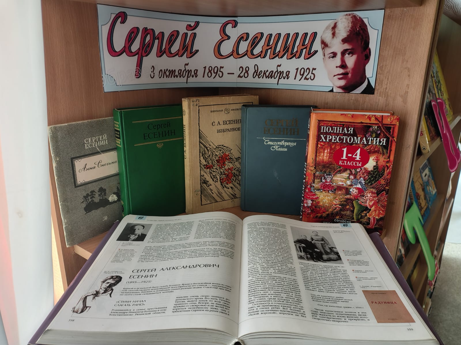 В библиотеке КГУ «Средняя школа №9 имени Ахмета Байтурсынулы» была оформлена книжная полка, посвящённая 130-летию со дня рождения великого русского поэта Сергея Александровича Есенина.