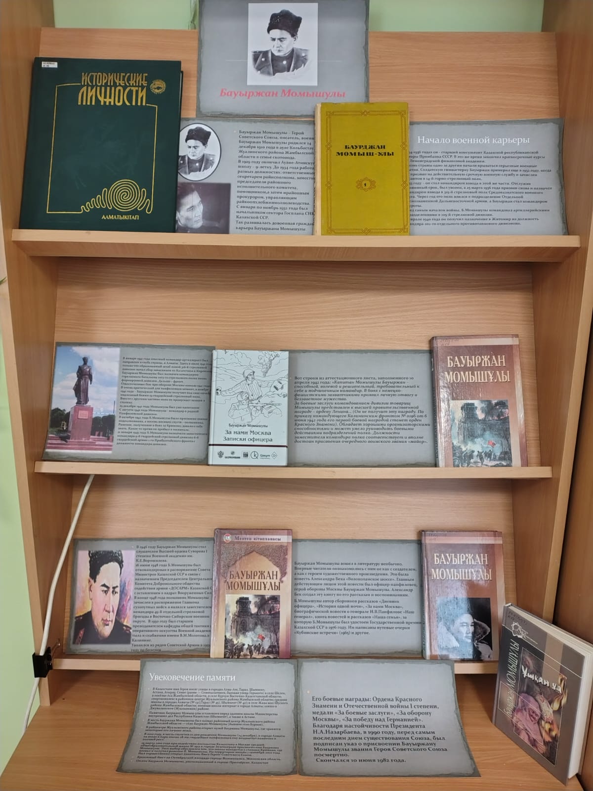 В этом году исполняется 115 лет со дня рождения Бауыржана Момышулы — легендарного героя Великой Отечественной войны, талантливого писателя и национального патриота. В честь этой знаменательной даты в библиотеке оформлена книжная выставка произведений Б. Момышулы, а также материал, рассказывающий о его жизни, воинском пути и литературном наследии.